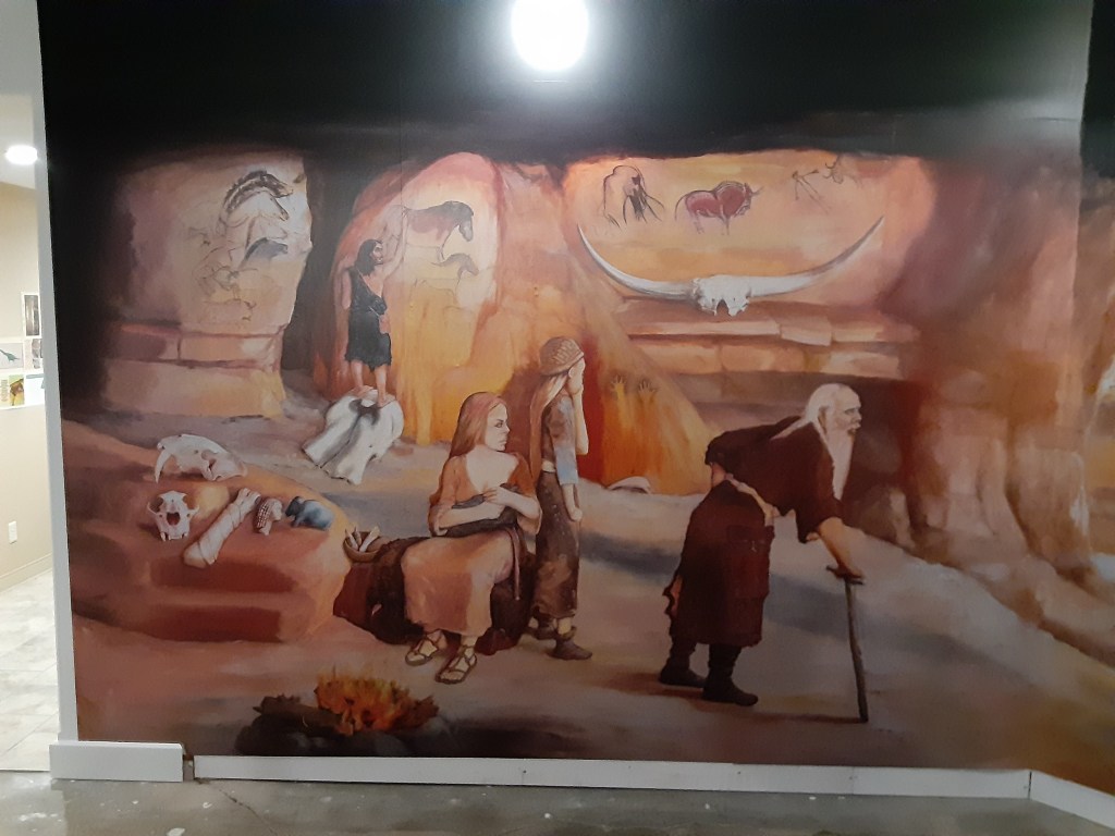 The mural was created by Joe Taylor, who has his own museum, the Mt. Blanco Fossil Museum in Crosbyton, Texas. As you can see, the mural blends right into the room. The room gives the impression of a cave and the mural shows us some of what is going on inside the cave as well as a view outside of it.