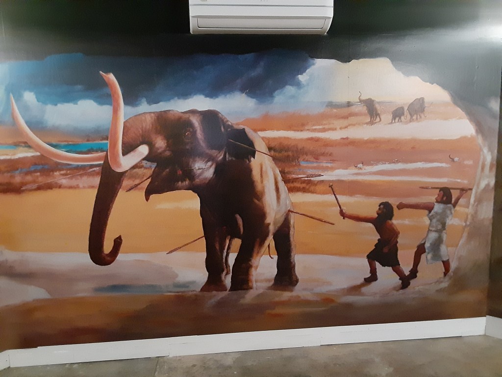 In the next part of the scene, we see the object of the hunter’s attention: a mammoth. This mammoth is a Columbian mammoth (Mammuthus columbi). While the woolly mammoth (Mammuthus primigenius) is the icon of the Ice Age, the Columbian mammoth was the mammoth most commonly found in southern regions of the United States, including Kansas. Since it did not live in the tundra, the Columbian mammoth had little or no hair. Also, it was larger than the woolly mammoth, which was “only” the size of the modern African elephant, both of which have a maximum size of about 11 feet tall at the shoulder. The Columbian mammoth was about 13 feet tall at the shoulder.