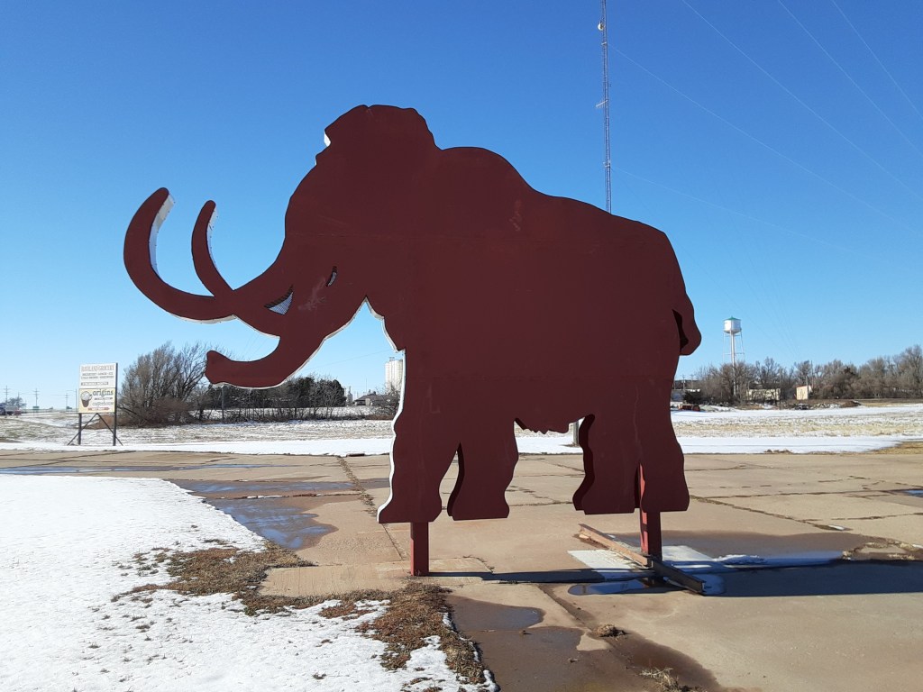 This sign is based on the image of a woolly mammoth. The sign is about fifteen feet tall from the base of its feet to the top of its head. This would put it close to thirteen feet tall at the should. Thus, even though the sign is based on a woolly mammoth, its size is actually close to that of the Columbian mammoth. So, if you want to see how big a Columbian mammoth can get, stop by the Heart of America Science Resource Center sometime.