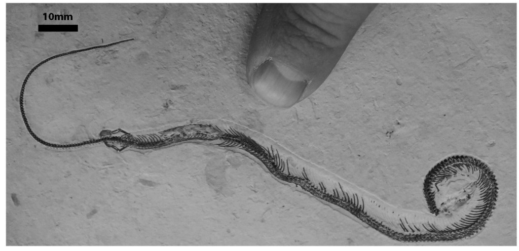 I might also add that the Tetrapodophis fossil does not look like it is easy to interpret. First of all, the fossil itself is surprisingly small. Second, the skull, which often carries several diagnostic characteristics, is crushed, leaving much to interpretation. See the illustration at the beginning of this article and the illustration below to see what I am talking about. In other words, I do not think that Tetrapodophis was identified as a snake because “evolutionists saw what they wanted to see,” but that it is a genuinely difficult fossil to interpret.