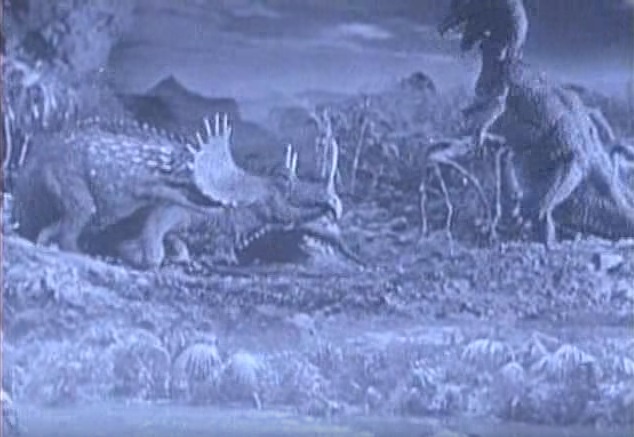 What I believe is the first full length movie featuring dinosaurs is the 1925 silent film The Lost World. It is based on the 1912 novel of the same name written by Sir Arthur Conan Doyle (yes, the same person who created Sherlock Holmes). The 1925 movie is actually pretty good for its time. The dinosaurs were presented using stop motion animation, and rather than showing them as mere monsters, they were portrayed as animals. For example, the dinosaurs stampeded from a forest fire. Triceratops parents defended an infant from a predatory attack. They were shown doing actual animal things. Sure, the fights between the dinosaurs were some of the highlights of the film, but there was some care to portray the dinosaurs as animals in between the fights. However, it is during the fights where Tyrannosaurus makes his grand appearance.