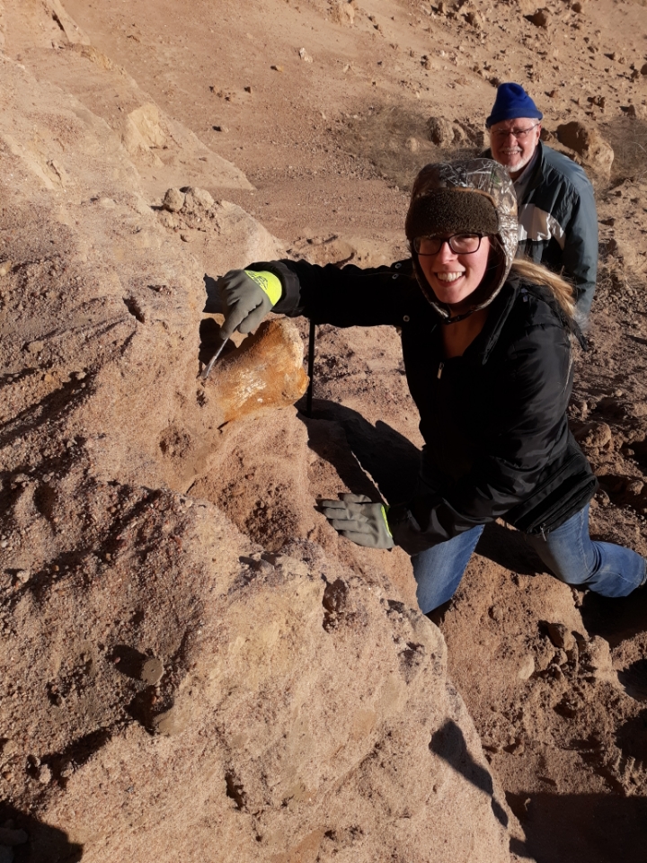 We spent the next few hours carefully working away the sand and clay with screw drivers and small shovels. It was a chilly day and I wasn’t dressed for an excavation but I wasn’t about to let that stop me! We were all smiles despite the cold! Once we had the whole bone uncovered we noticed a break right in the middle, very common with large bones as the weight of the fossilized ends can put stress on the middle. This proved to be a blessing in disguise though because now we could see the incredibly preserved bone marrow inside! This will allow for easy recovery of samples for testing in the future.