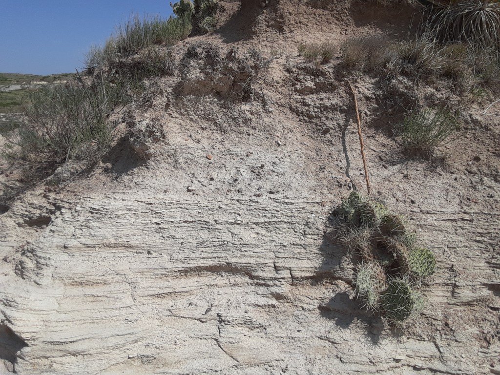 The Niobrara Formation is sometimes called the Niobrara Chalk. It is not made of true chalk, but it is composed of microscopic fossils composed of calcite, which makes it appearance and texture similar to chalk. The Niobrara Formation is one of the more famous and well known fossil bearing rock layers in Kansas. Most of the classic fossils from Kansas, such as mosasaurs, plesiosaurs, sharks, and Pteranodon, come from the Niobrara Formation. I want to share some photographs of what I found at the Amazing Grace Ranch.