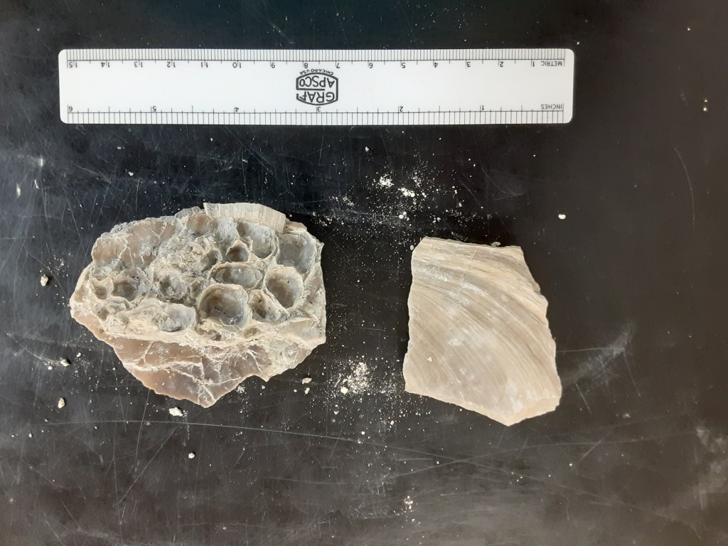 The most common fossils found in the Niobrara Formation are bivalves shells: clam shells. I found two types: large inoceramid clams and smaller oyster shells. Both types of shells can be seen above. On the right is a fragment of an inoceramid. On the left is another fragment of an inoceramid but with oysters attached to it.
