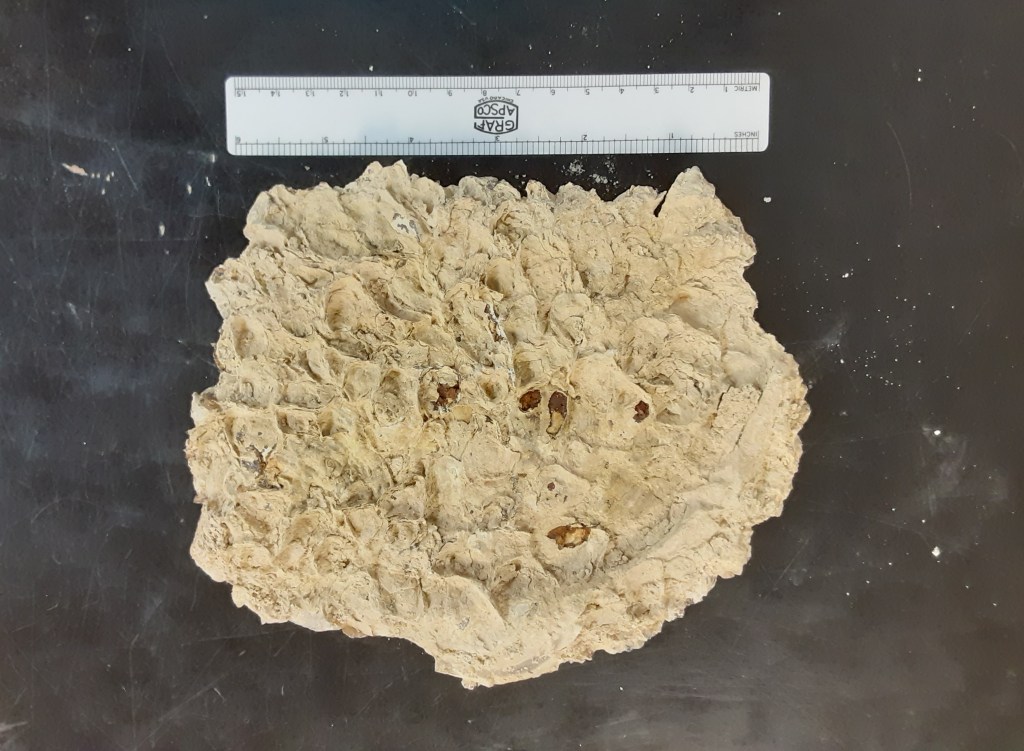Here is another inoceramid with attached oyster shells. Between the oysters and sediment attached to the shell, you basically cannot see the inoceramid underneath. However, this specimen illustrates how large inoceramids can get. Some larger specimens can get to be two feet across!