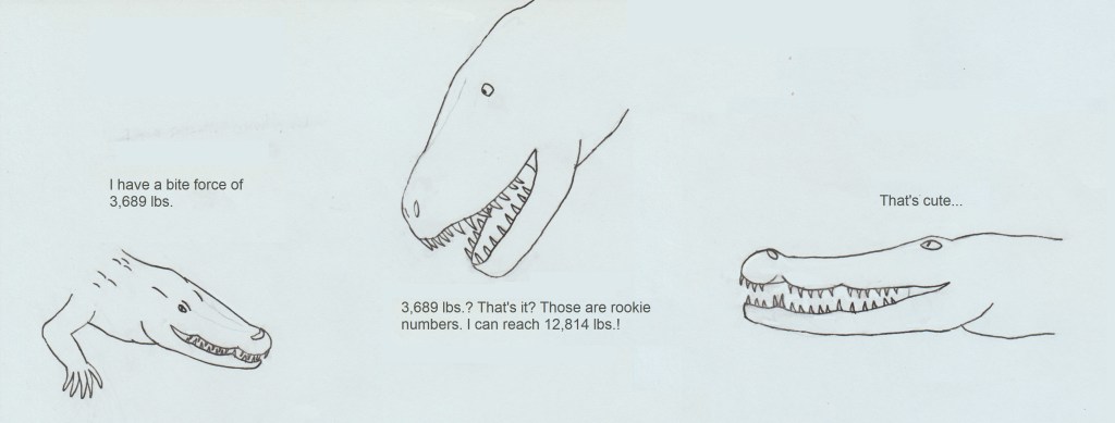 Before I reveal its bite force, I want to clarify a few things about Deinosuchus. First, some of you may be wondering, “But I thought Sarcosuchus was the largest crocodile. Why not give the bite for of that one?” While Sarcosuchus is a crocodile, it is not a crocodilian. While we use the term “crocodile” for a specific family of living animals, the term “crocodile” can also apply to the large group called Crocodylomorpha. The crocodilians, which is the group that includes the living crocodiles, alligators, and gavials, is just one group within the larger Crocodylomorpha. Thus, Sarcosuchus is a crocodile (belongs to Crocodylomorpha) but is it not a crocodile (does not belong to Crocodylia, the crocodilians). Since it does not belong to the same group as living crocodiles and alligators, we do not know if its bite force scales the same way. Thus, we will have to use Deinosuchus riograndensis, since it does belong to the Crocodylia group.