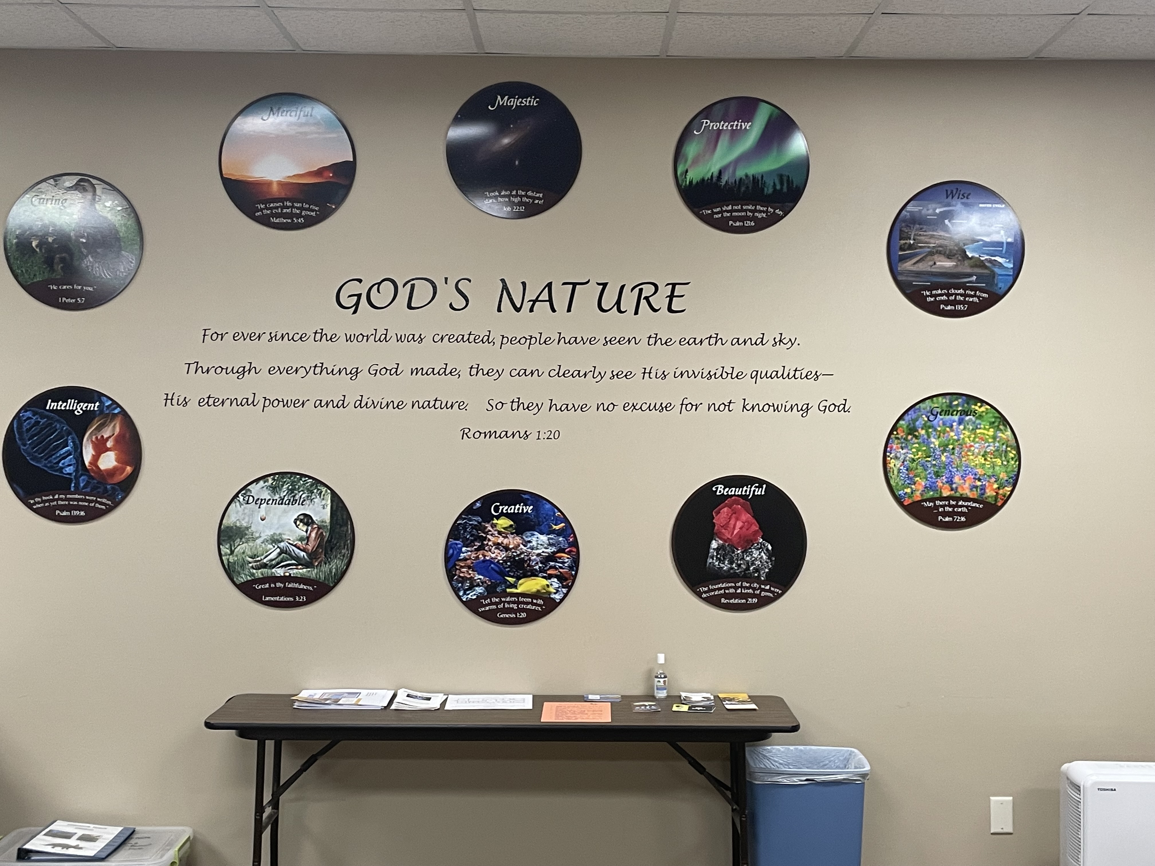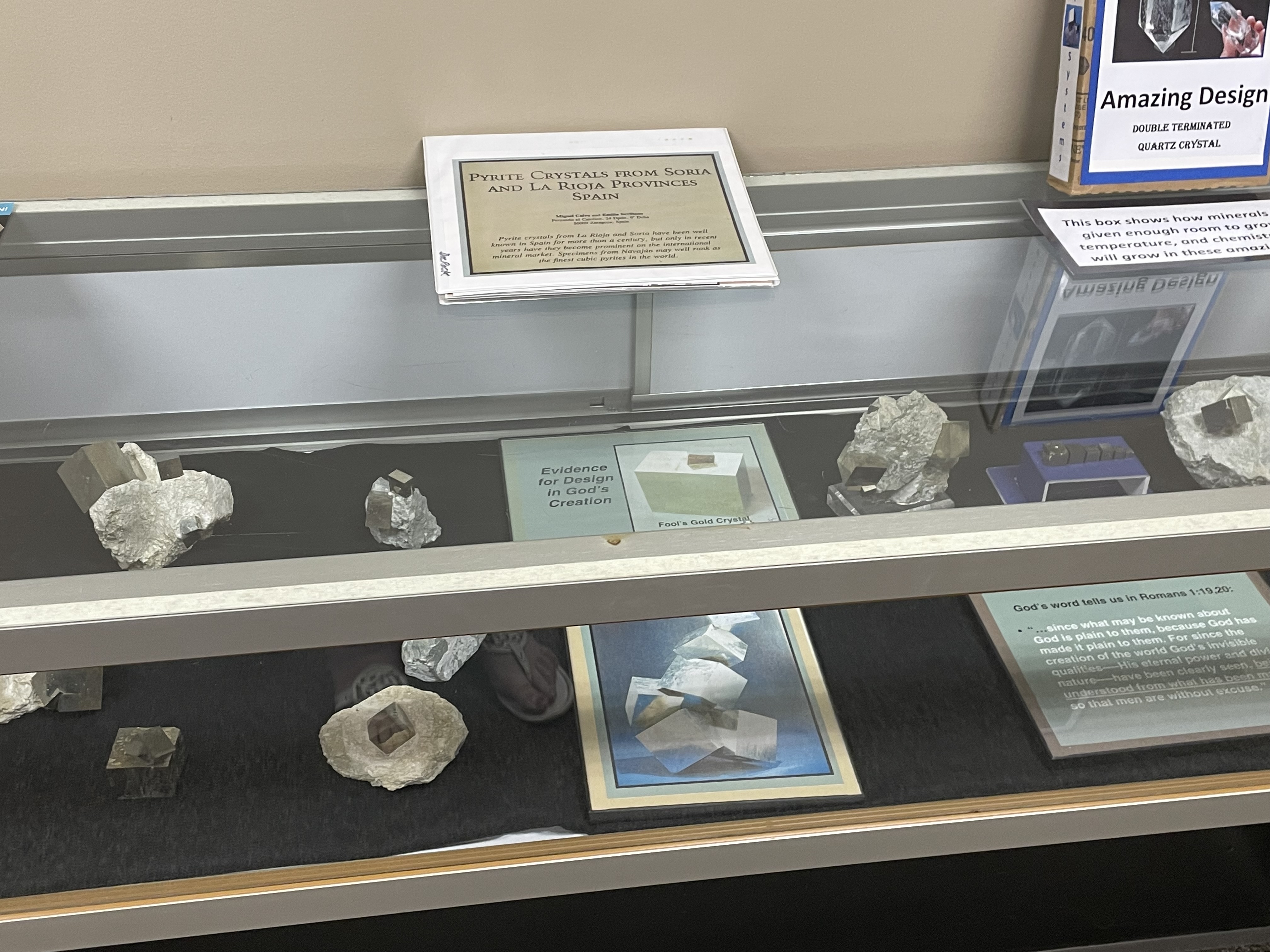 This room, which comfortably holds 60 people, honors Miriam and Leonard Mitchem for their faith and dedication to teaching about the Lord’s creation. Inspiring education occurs here during conferences, movie nights, day camps, and other gatherings that build the faith of the attendees and help participants to become brighter lights for the Lord. Two popular attractions in this room, “Tiffany,” a 3-foot-long Triceratops robot and “Dino,” a 7-foot-tall T-Rex sculpture crafted of polished wood, bring attention to the astounding discovery of soft tissue that has recently been found in dinosaur bones. A collection of iron pyrite (fool’s gold) crystals which are found as naturally occurring perfect cubes is displayed along one wall, while a large array of framed photos with accompanying Scripture verses highlights the attributes of God seen in “His Nature” on another. Truly, we are all without excuse if we don’t believe in God because of what He has revealed of Himself through His astounding creation!