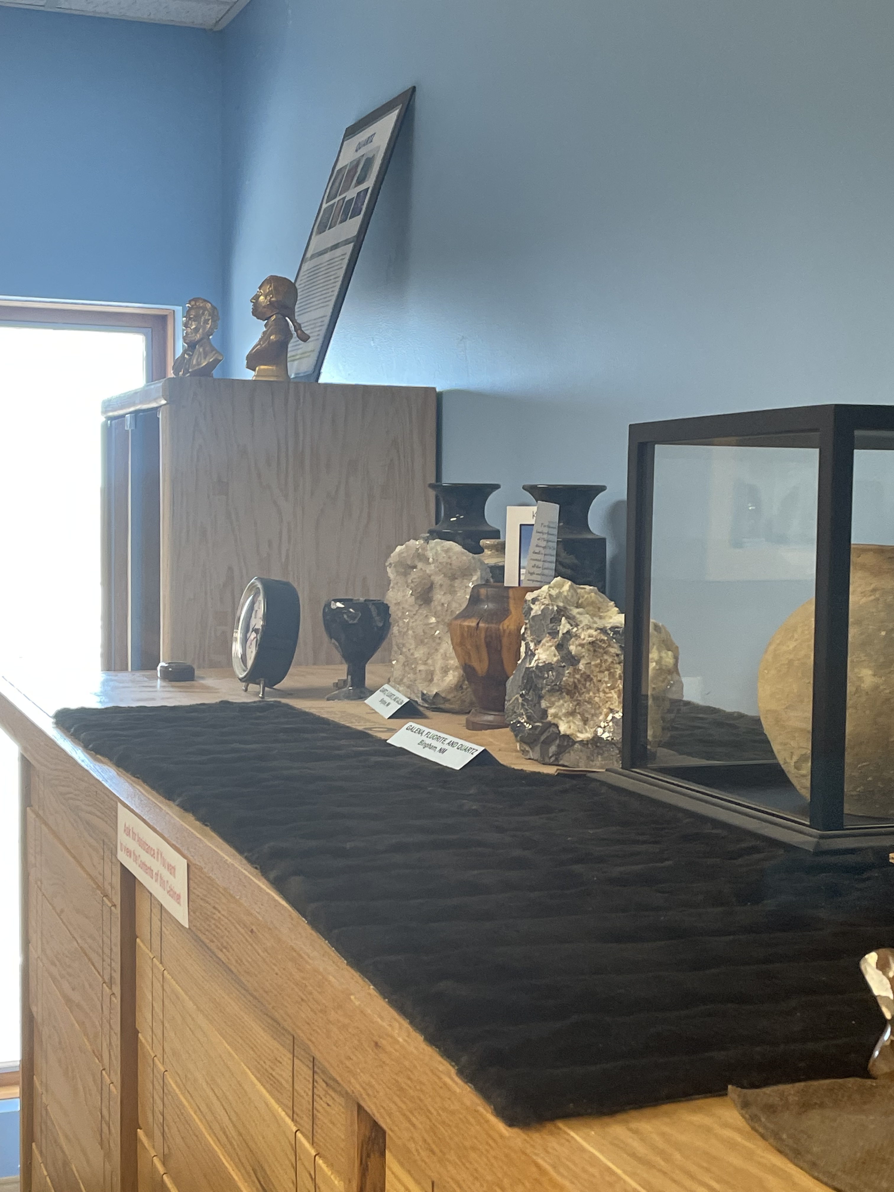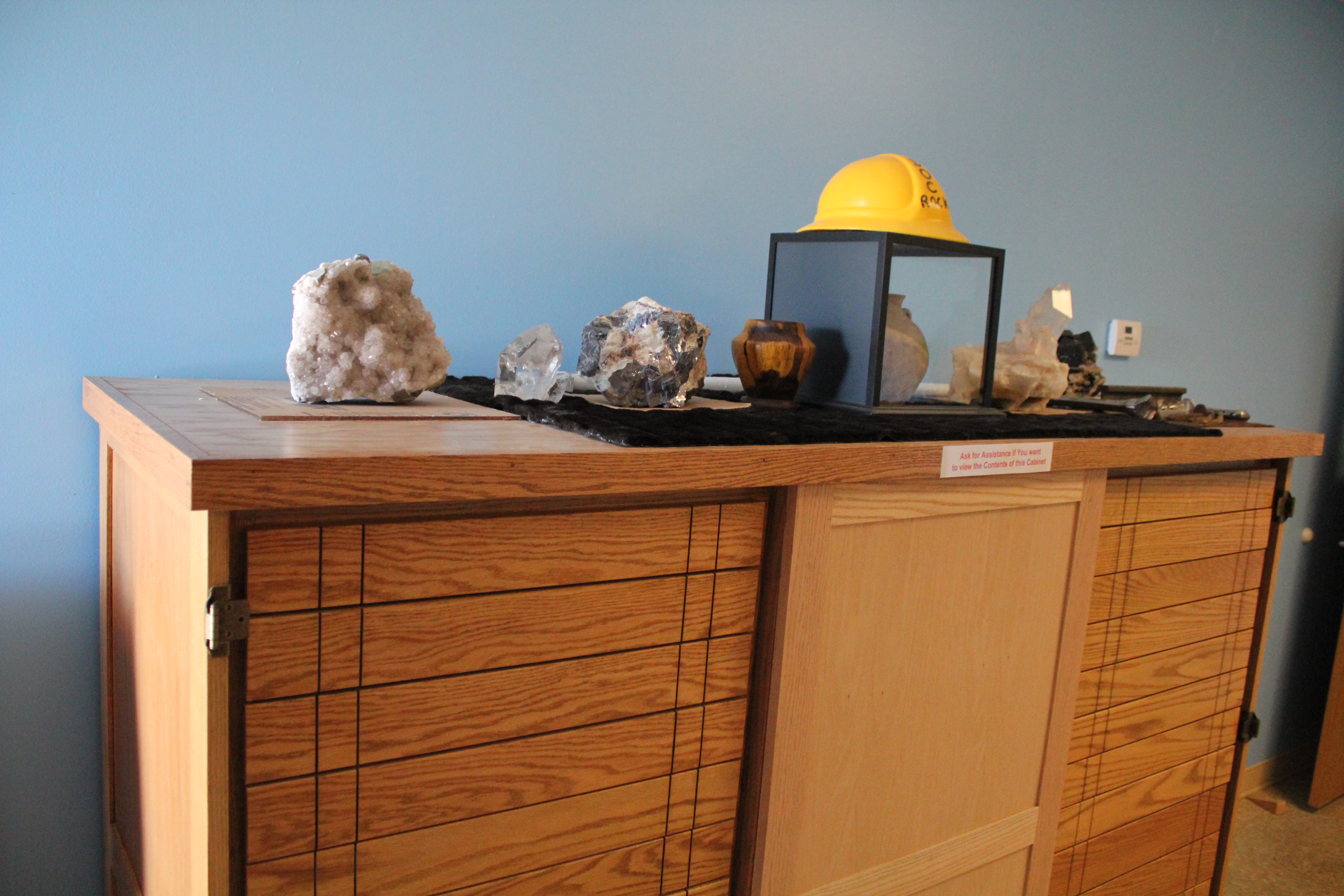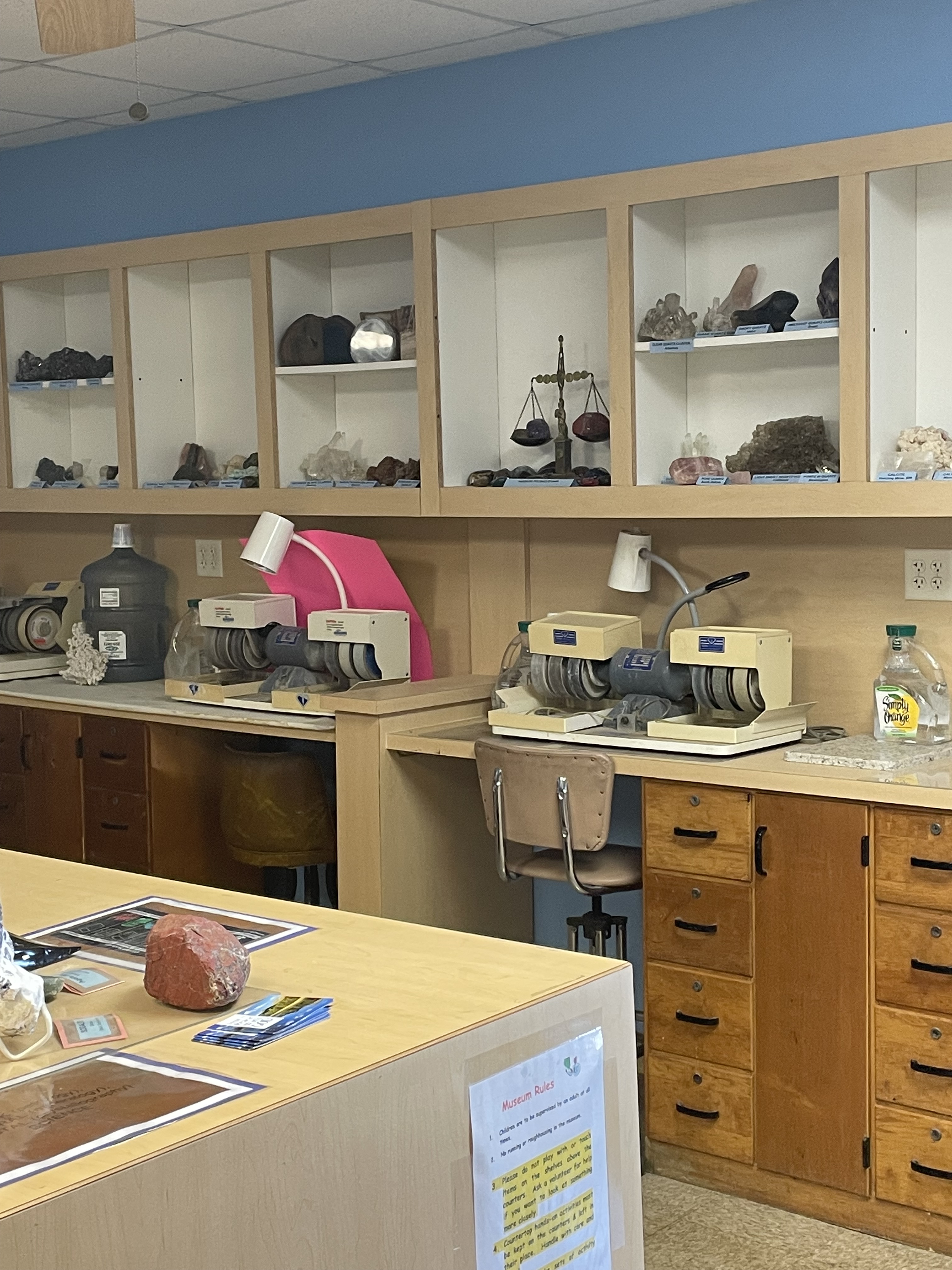Visitors are then enamored by the awesome shapes and colors of the natural crystals and minerals displayed in a beautiful wood cabinet specially crafted for this collection by Steve Larsh of Haviland. Handling a falling star (a meteorite that has made it to Earth) is a popular activity in this room. And in our lapidary workshops, participants enjoy shaping and polishing a rock in less than an hour.